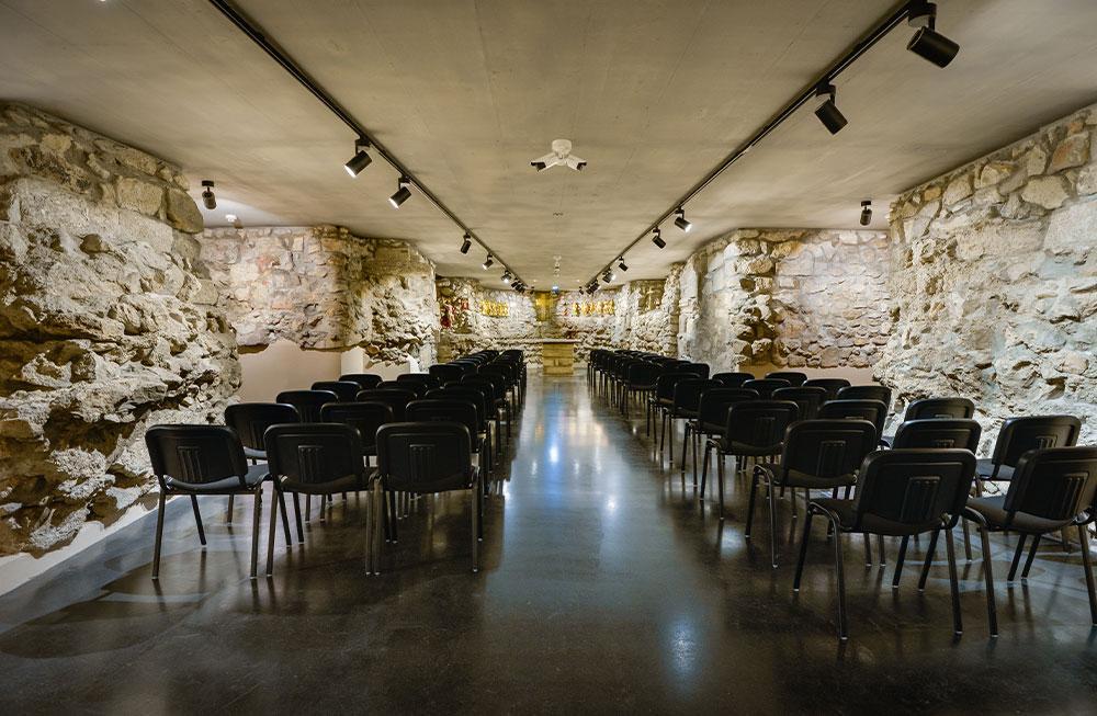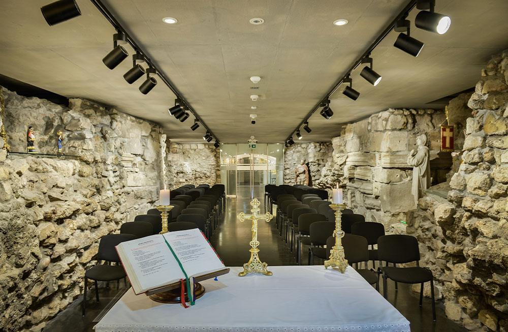 A XI. és XII. században ennek a római erődnek a köveiből épült fel az a román stílusú templom, amelynek alapfalait még ma is láthatjuk a Belvárosi plébániatemplom altemplomában. Ezt az altemplomot a régészeti kutatásokkal egy időben alakították ki. Múzeumában megtekinthetők a feltárások során előkerült tárgyak, kották, misekönyvek és a brünni Madonna ikonképe. De itt látható az ún. Szent Kereszt ereklye is, amelyet XI. Piusz pápa ajándékozott a Pálos rend számára 1934-ben.