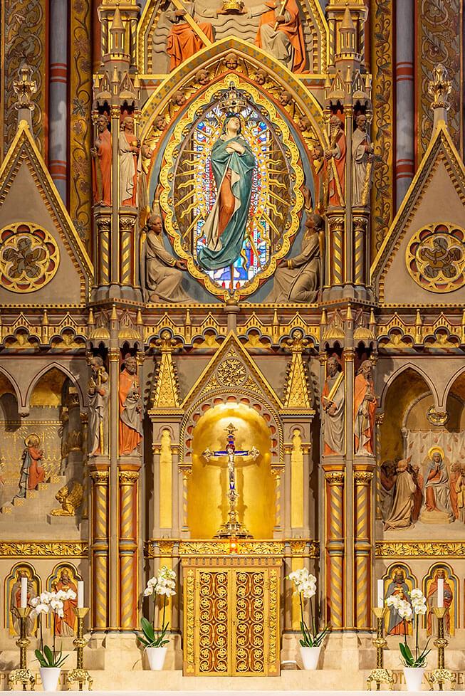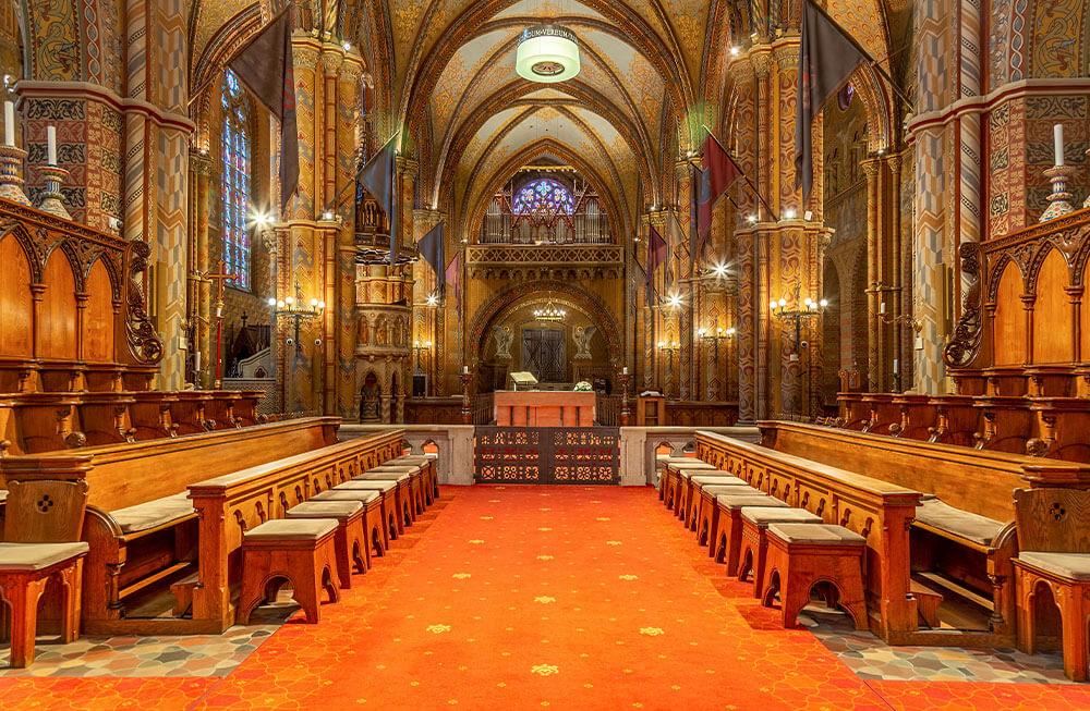 This renovation was led by Frigyes Schulek, who carefully designed the neo-Gothic building to the form we know today. The architect worked with such masters as Károly Lotz and Bertalan Székely on the interior painting and decoration. Frigyes Schulek equipped the church with the most modern technology of his time: he used air ducts for heating, and the gas pipes were brought up to the Castle Hill only to provide modern lighting. Today they use hundreds of LED bulbs instead of gas, the lighting is controlled from a tablet, and at the Sunday sign language services they can now project the sign language interpreter's camera image and subtitles for the hearing impaired members of the congregation using a projector.